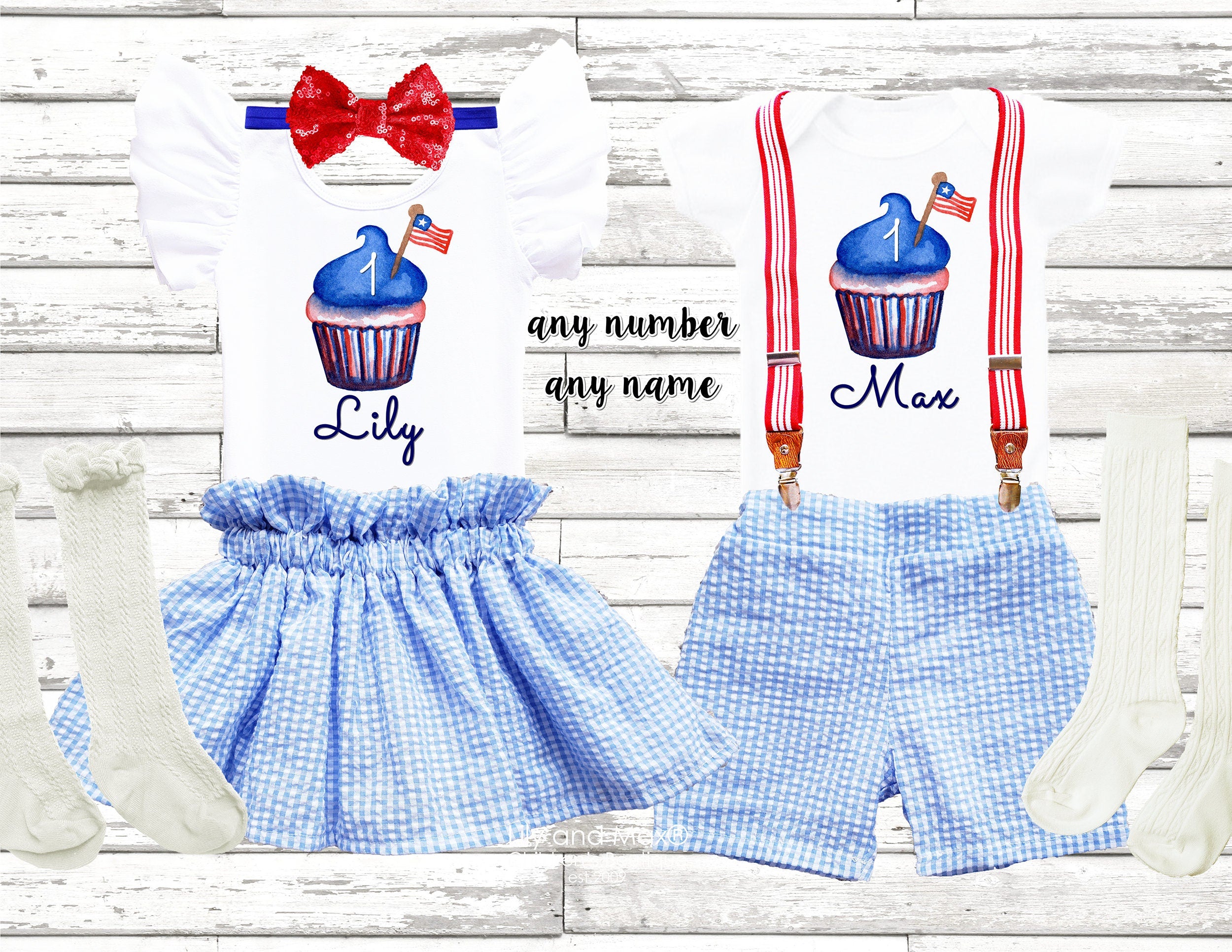 Seersucker 1st Birthday Outfit: Patriotic Cupcake, Personalized