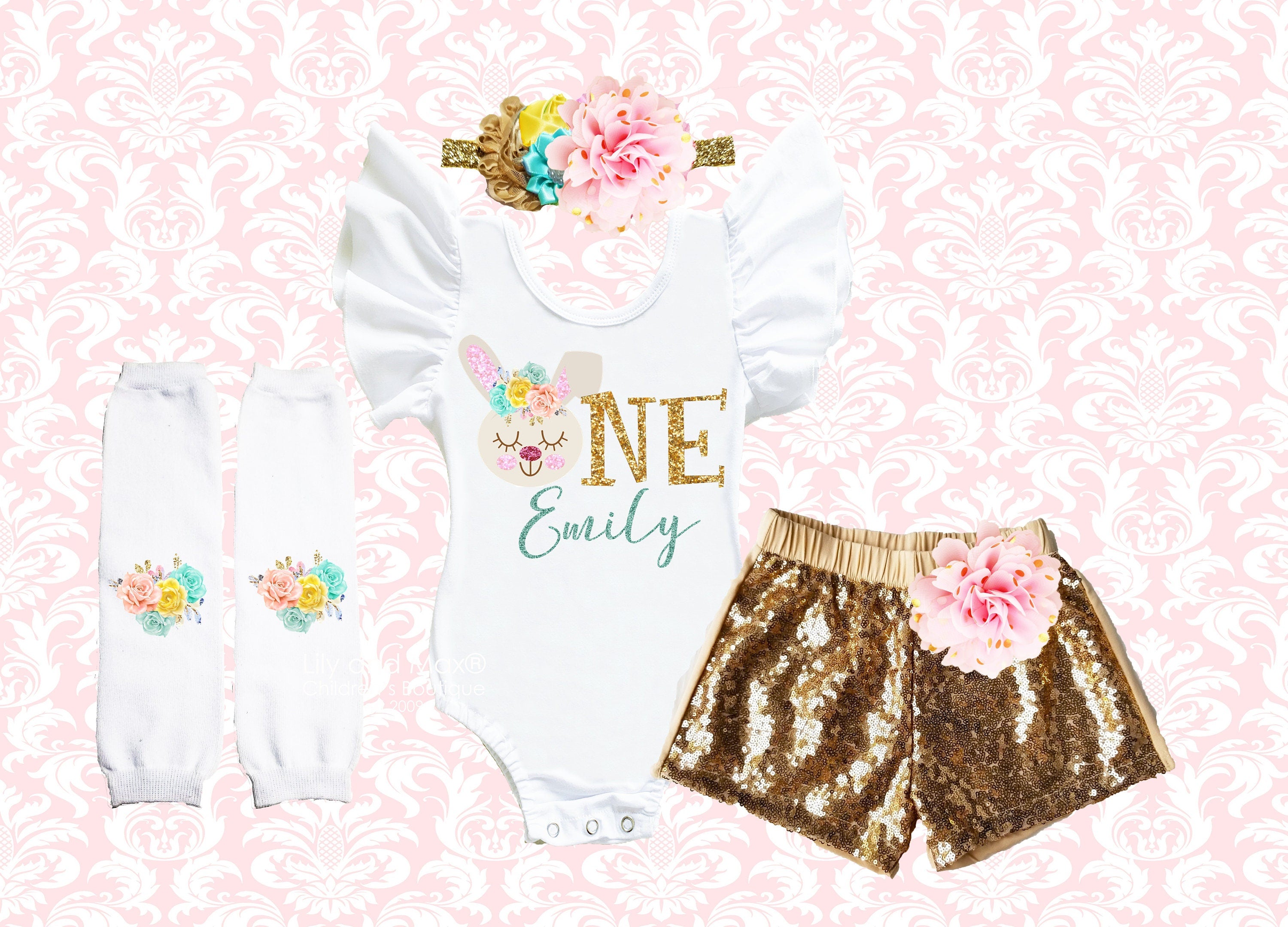 1st Easter girls outfit, first Easter girls bunny GOLD sequin short outfit, Bunny girls smash cake outfit, bunny face flutter sleeve leotard