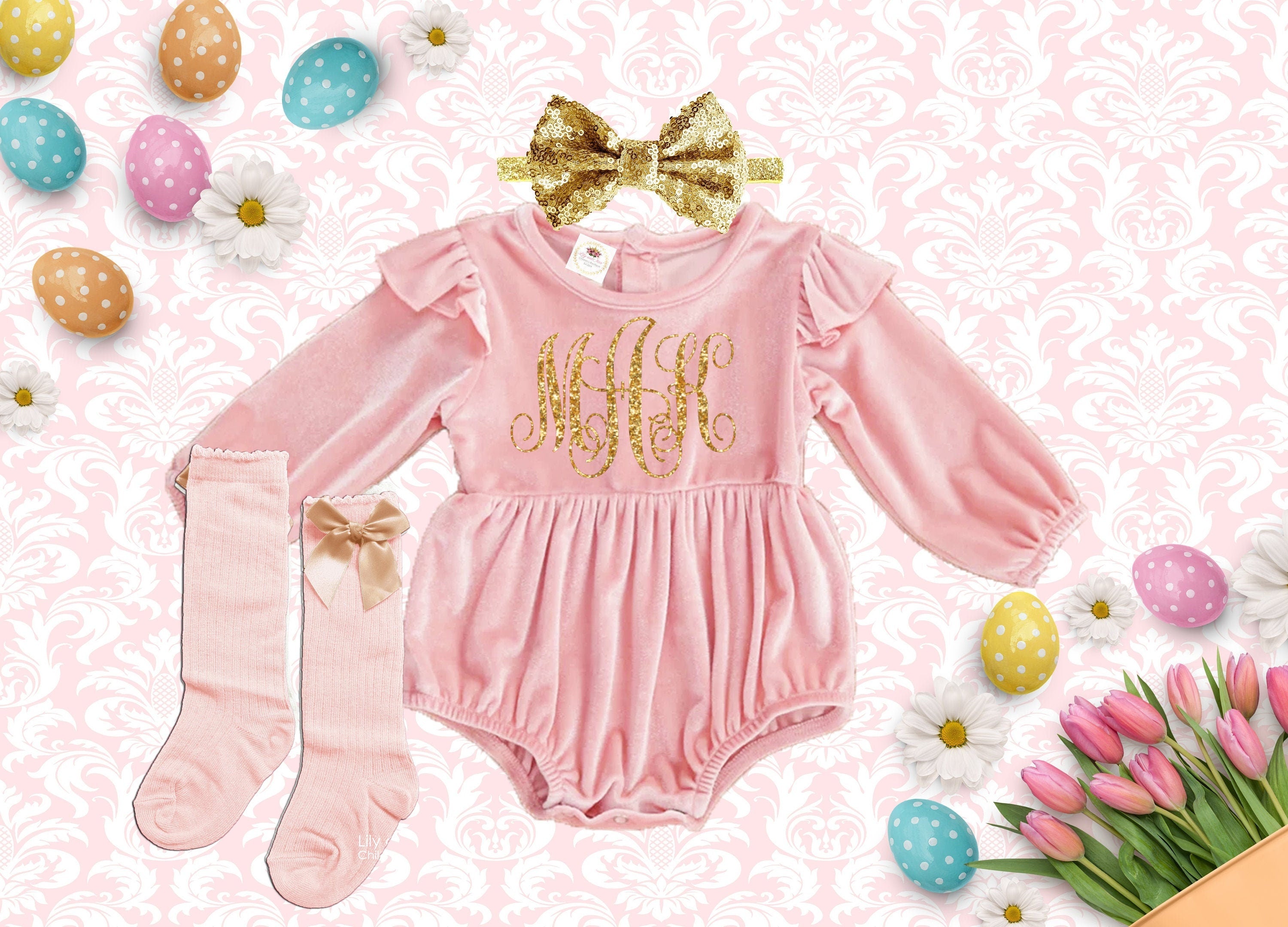 Monogrammed Easter Velvet Romper: Baby Girl Outfit with Sequin Headband