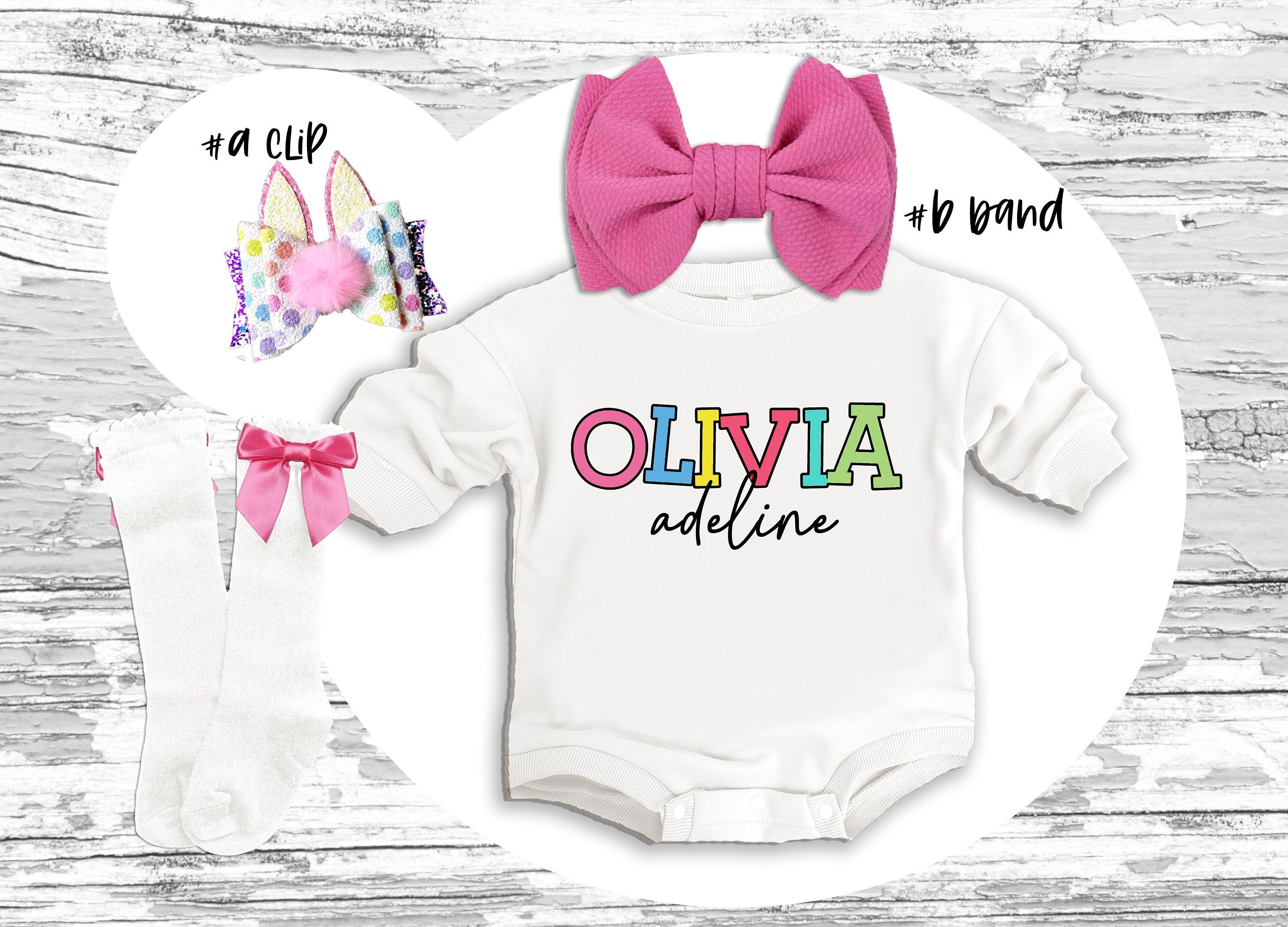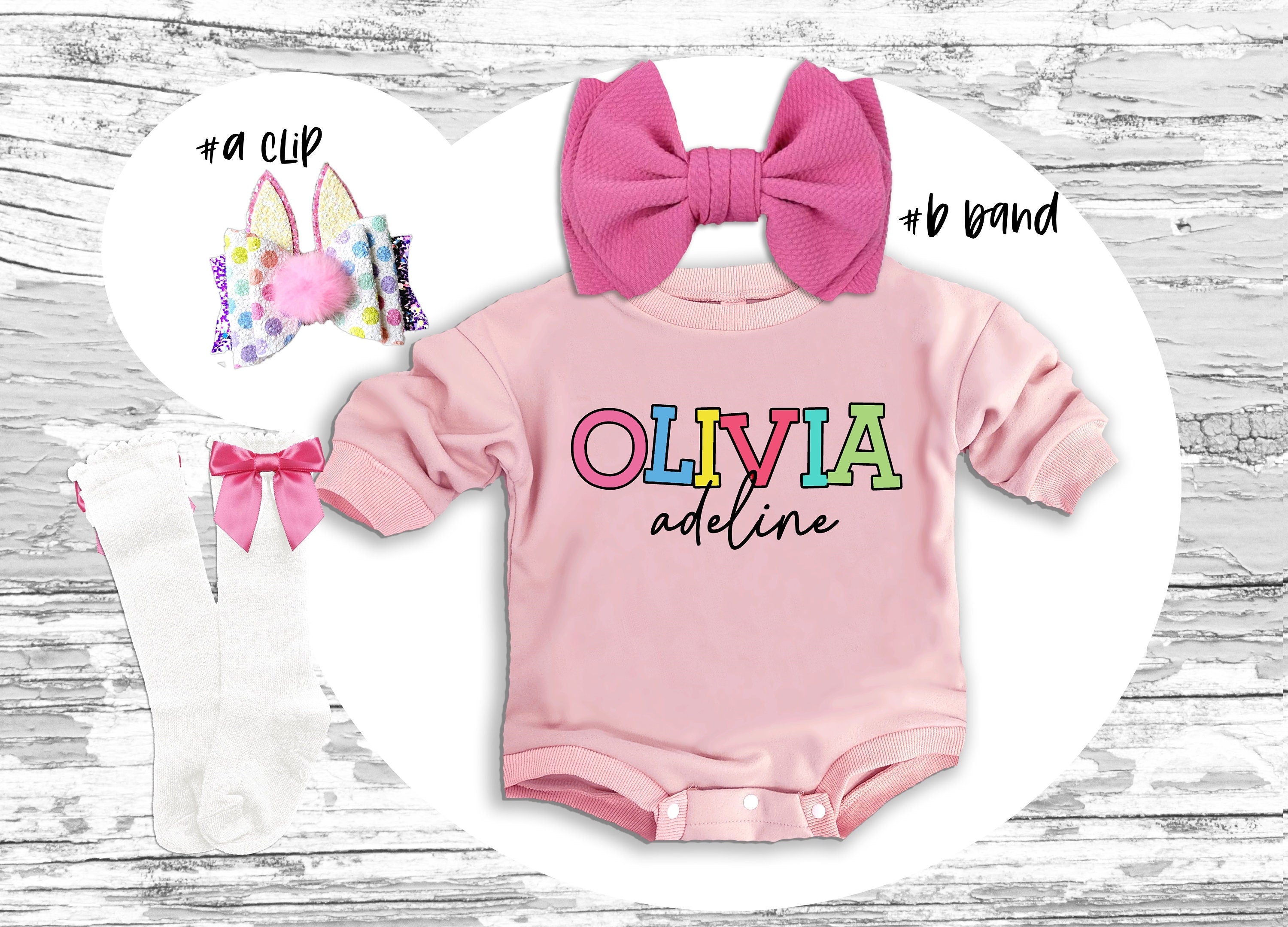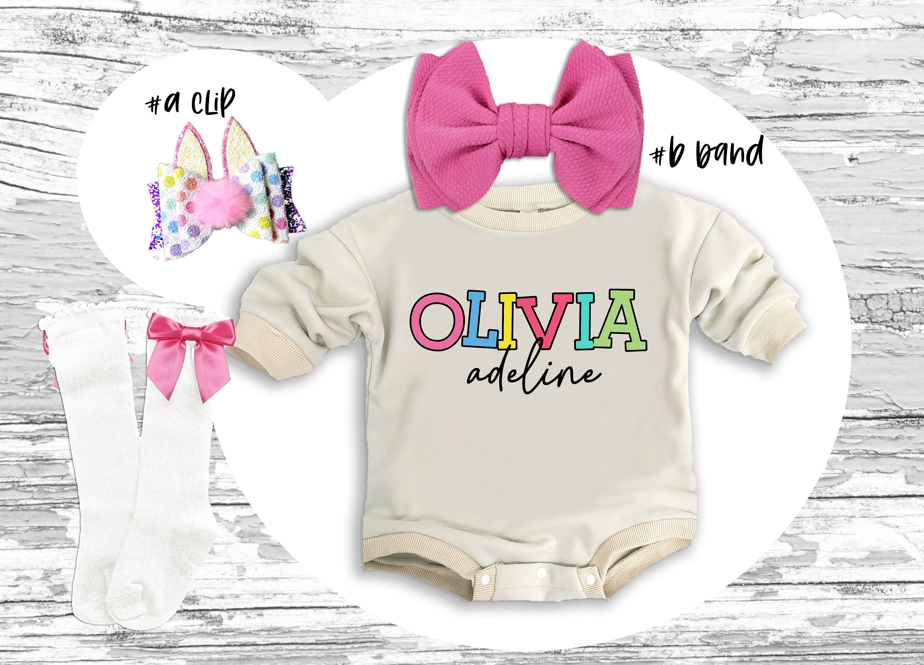 Personalized Easter Baby Outfit: Romper, Bow Clip, Headband & Socks