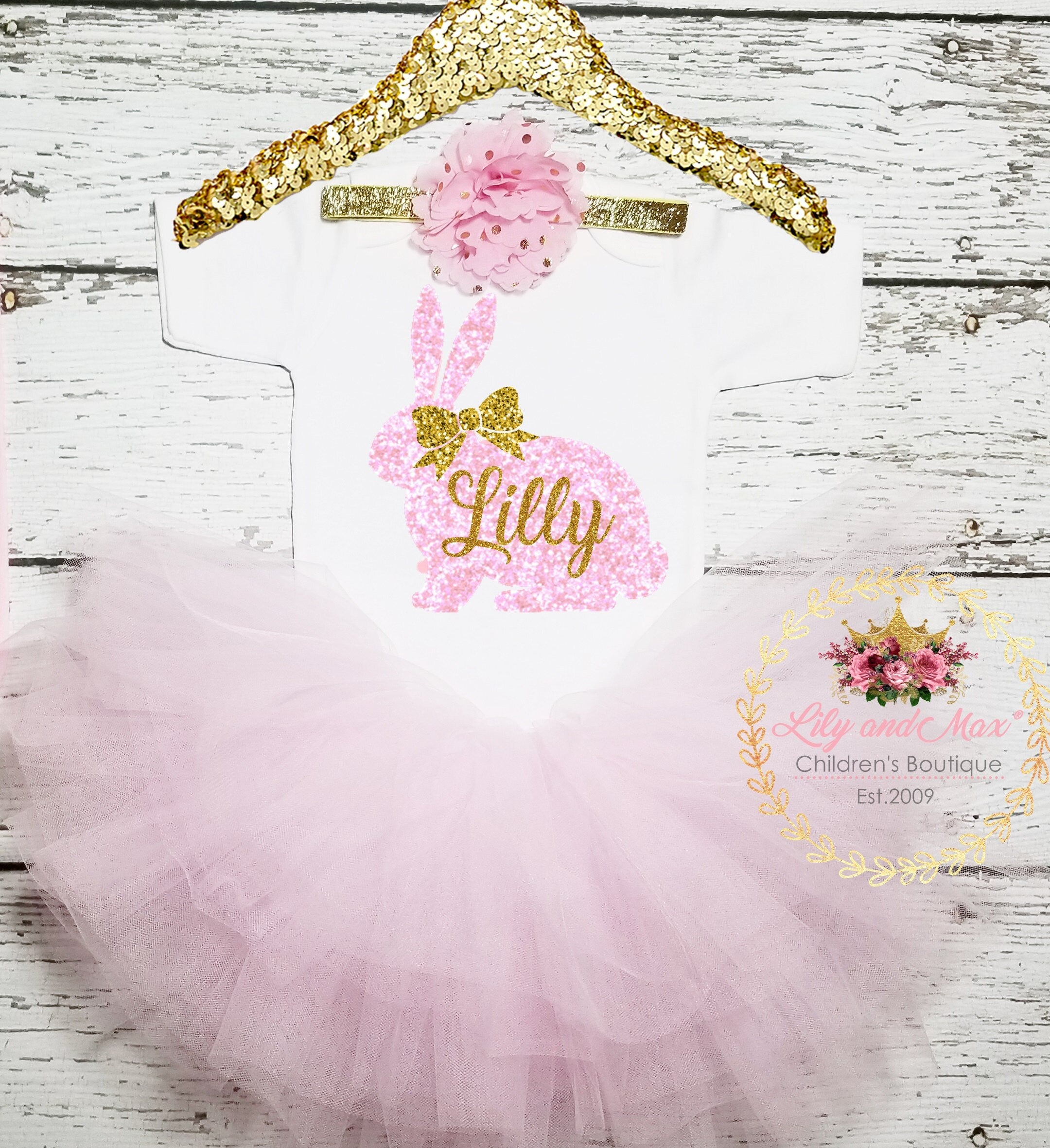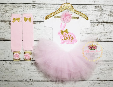 Personalized Easter Bunny Tutu Outfit: Gold Glitter Bodysuit, Flower Headband