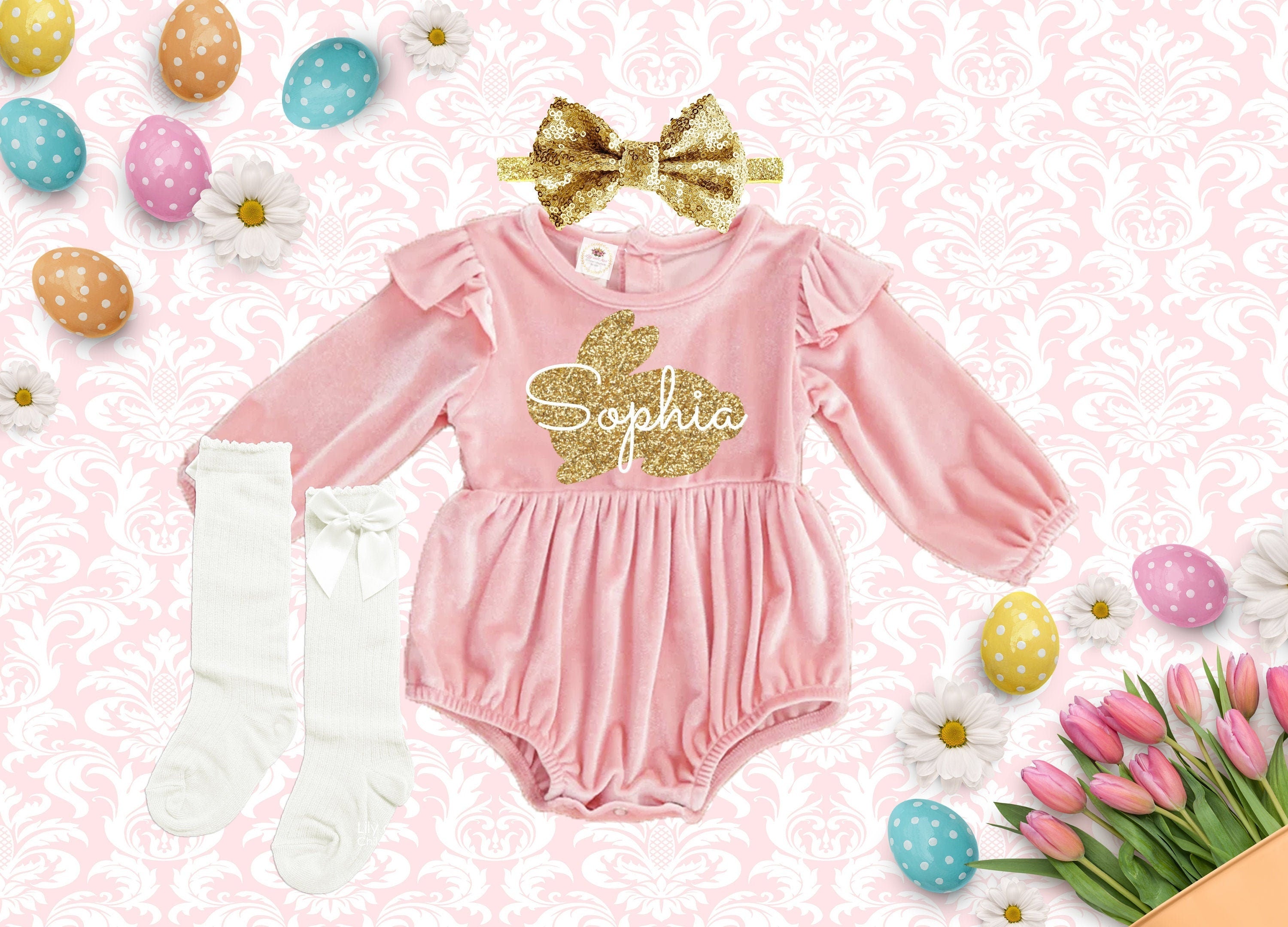 Personalized Easter Velvet Romper: Baby Girl Outfit with Sequin Bow