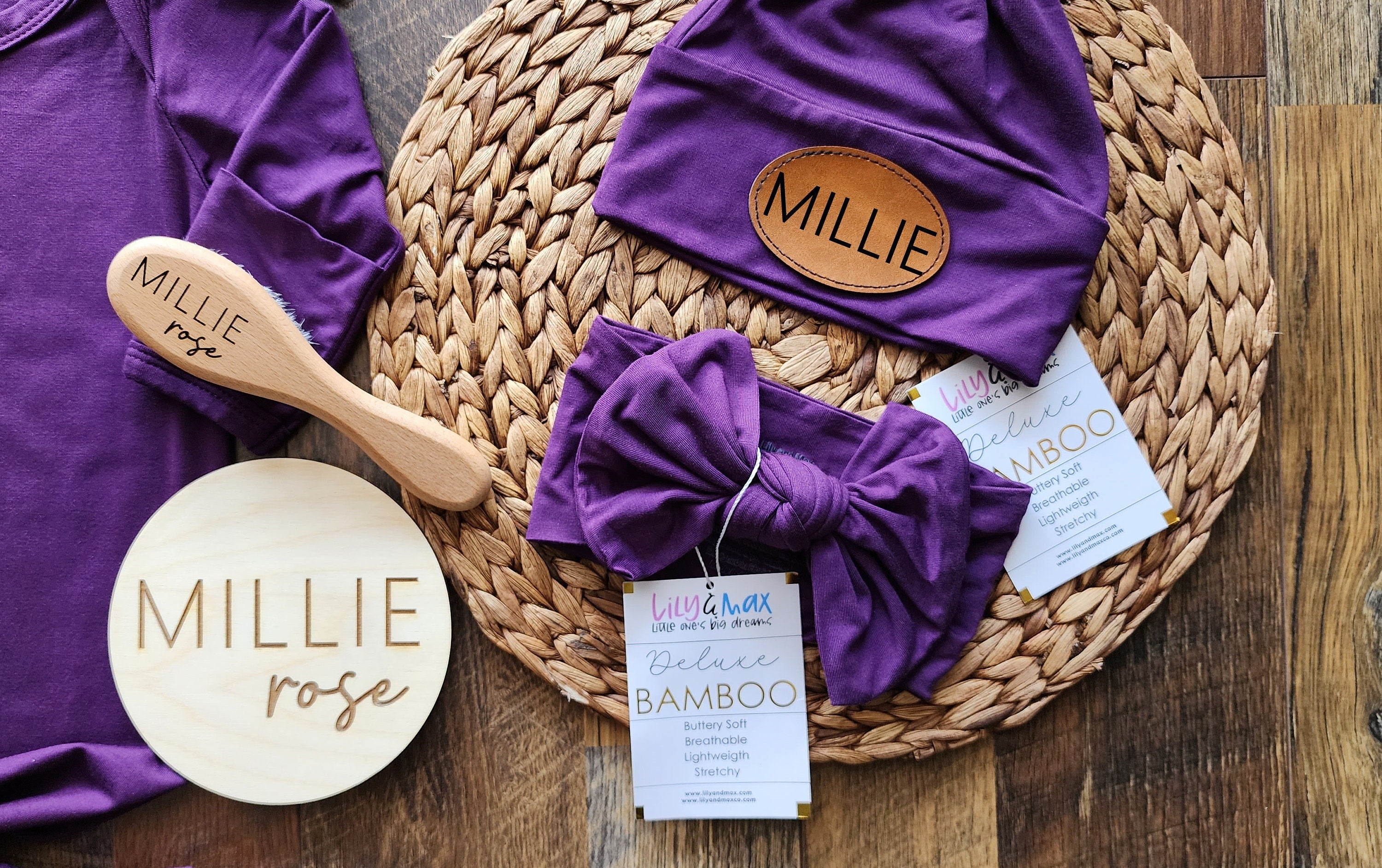 Bamboo Baby Gown Set: Personalized Purple Knotted Gown, Hat & Headband, Maternity robes, Gifts