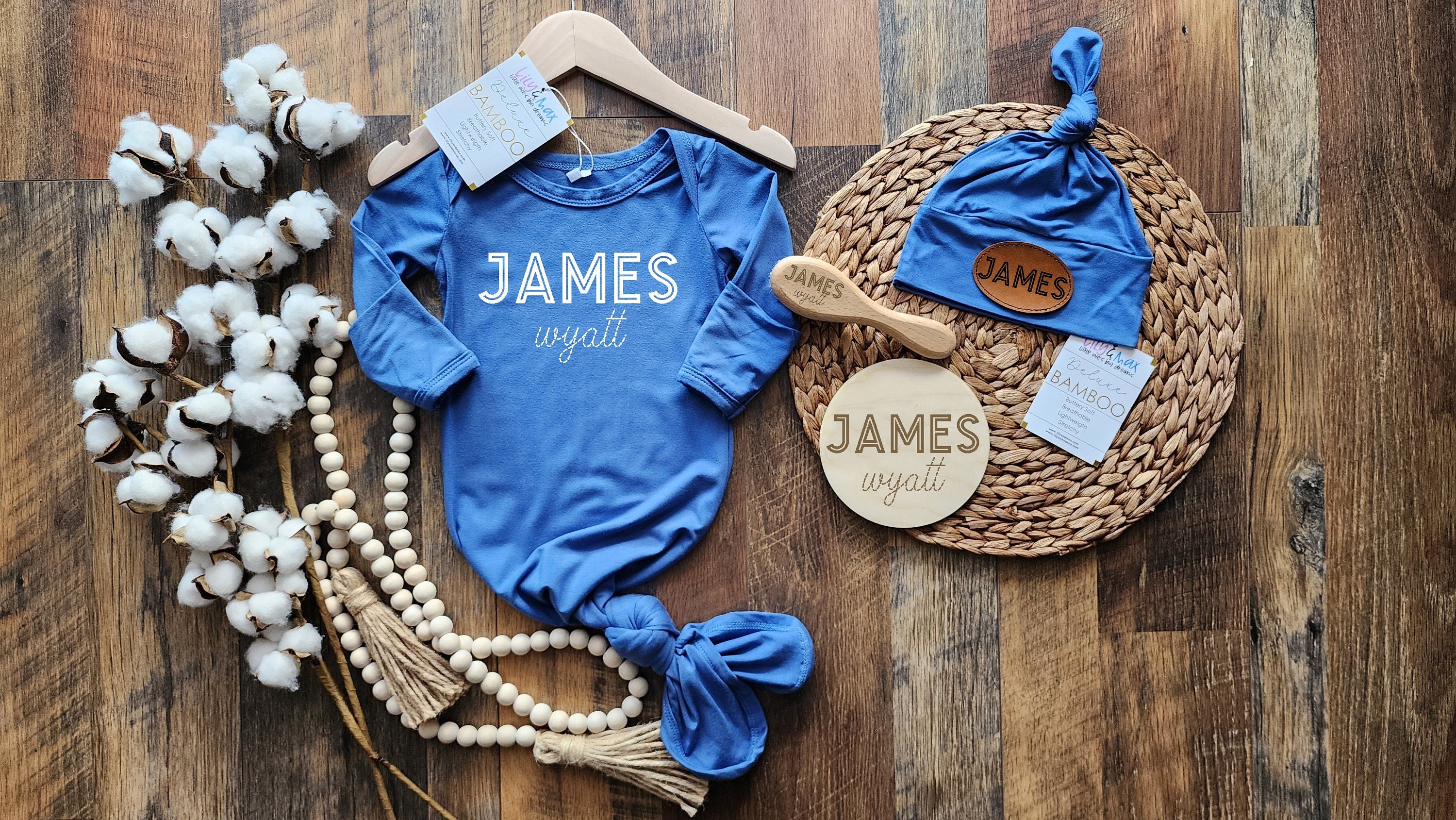 Blue Bamboo Baby Gown Set: Knotted Newborn Outfit, Personalized Hat