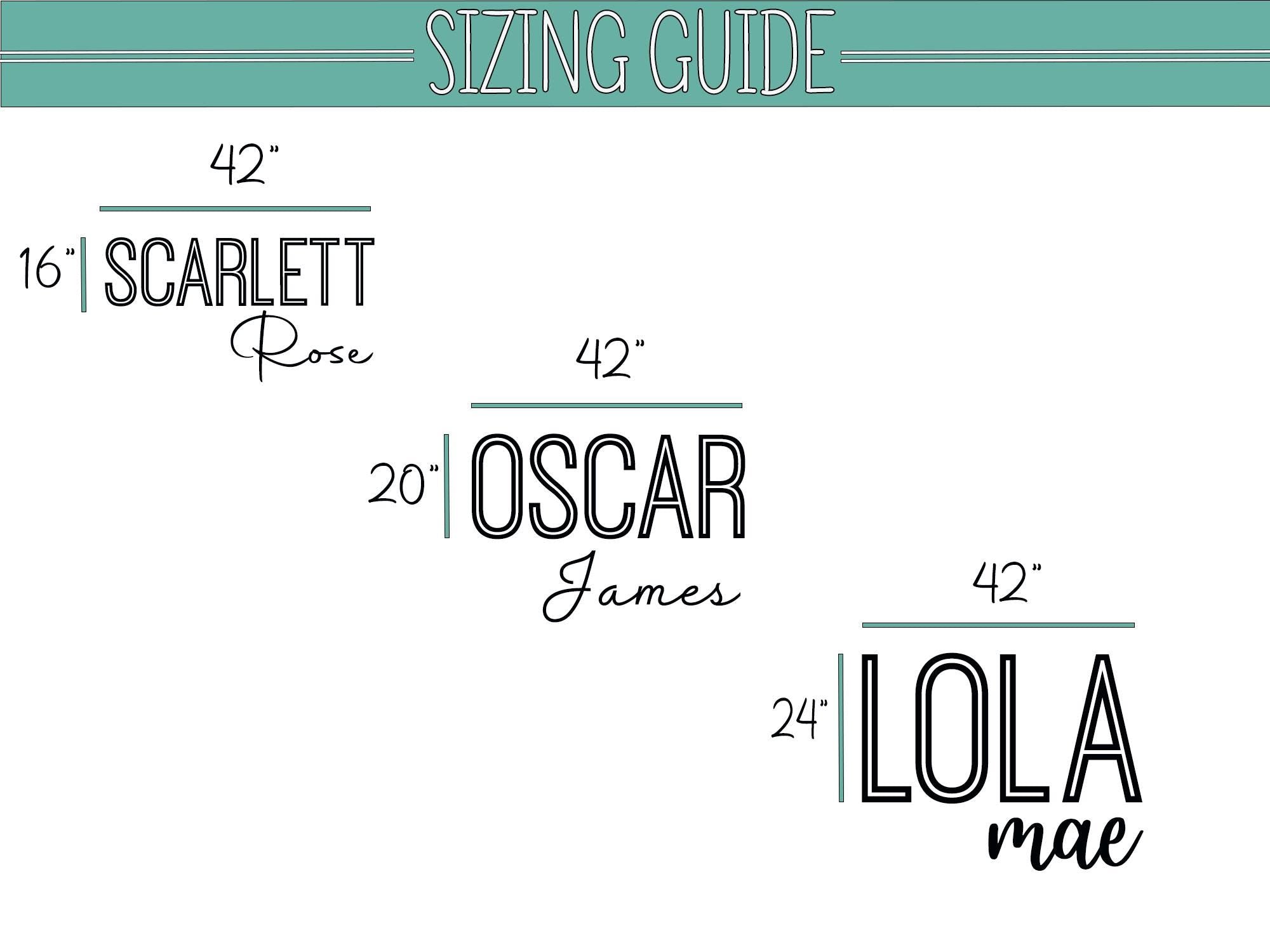 - Each style of font has different height as a result of that height of your sign will vary depending on the font style and name length. Height of the names have many letters will be shorter than the names have less letters. See " SIZING GUIDE" in the listing description pictures for more info.